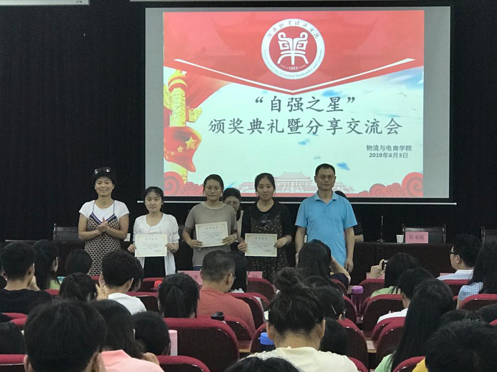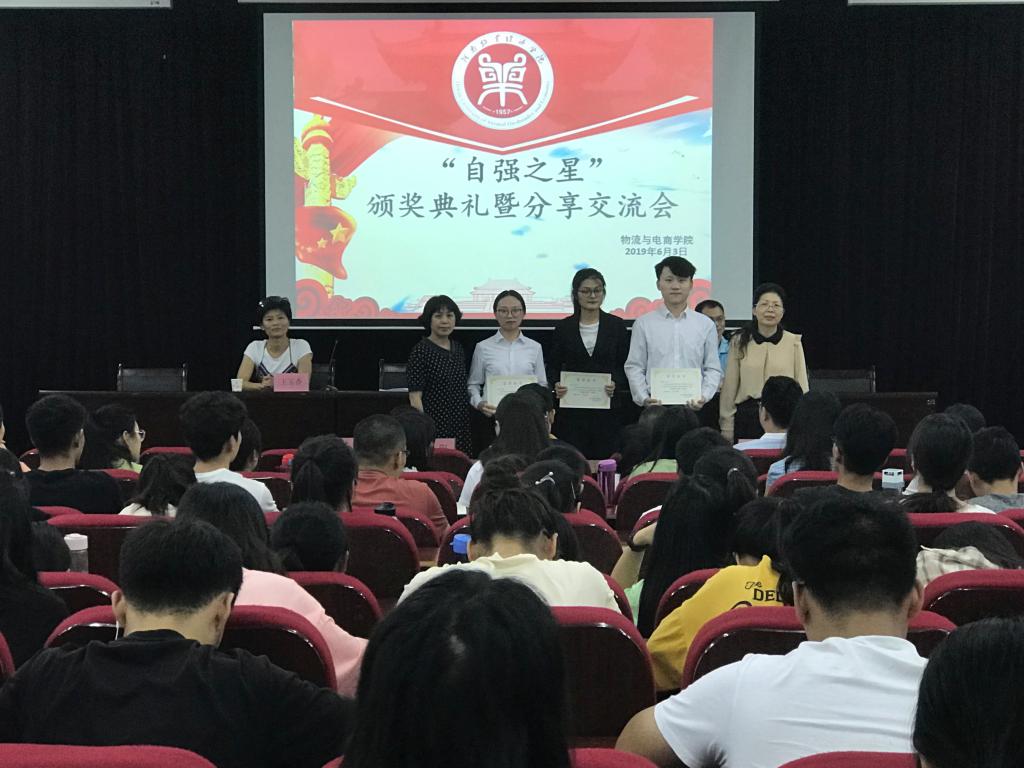 典礼初始,主持人代表学生向到来的嘉宾表示了热烈的欢迎。接着,资助中心王玉英主任发言,她代表学校向获奖的同学表达了热烈的祝贺。她讲到,当代年轻人,尤其是处于大学时期的年轻人更应该趁着自己年轻力壮、朝气蓬勃而努力一把,让自己的未来不留遗憾。同时,她也希望同学们以“小我”为出发点,让自立自强成为勇往直前的动力。紧接着,由我院宋之苓书记为本次典礼致辞,她提及在人生的道路上,我们每一个人可能会遇到各种不同的困难和挫折、打击和失败、但是我们不能因现实的交杂而放弃梦想。她建议同学们要让自强成为一种习惯,勇敢的面对每一天,走好每一步。随后,由参会嘉宾分别为“自强之星标兵奖”、“自强之星提名奖”、“自强之星鼓励奖”的获得者们颁发获奖证书,并在同学们热烈的掌声中与获奖者们合影留念。最后“自强之星标兵奖”的获得者17物流管理(采购与供应链管理方向)01班柳蕊、17物流管理01班的张孝文、17物流管理(电子商务方向)01班的肖静向同学们分享了自己的经验。他们三位一致认为,积极的参加各种活动能够充实自己,从中学习到宝贵的经验方法。而对待学习,同学们不能懈怠,知识都是在日积月累、坚持不懈中储备下来的。他们建议同学们要擅于把理论知识应用到实践中,也不要仅限于学习课本知识,课本以外的世界也很精彩。三位标兵的交流分享给同学们树立了榜样,让同学们从中受益良多。本次颁奖典礼暨分享交流会圆满结束。