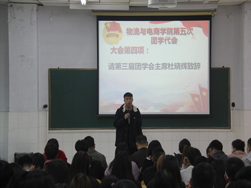 大会开始,全体师生起立,共同奏唱中华人民共和国国歌,气势雄伟,所有人面向国旗,歌声中饱含爱国之情。歌声落,紧接着第四届团学会主席孙胤致大会开幕词,他首先总结并赞扬了上一年团学会取得的优异成绩,紧接着提出了对于团学会工作的一些建议, 也对19级新一届团学会的干事们提出了几个要求,并对于新生干事们给予鼓励,也说出了自己对于团学会大家庭的美好祝愿。紧接着,由物电学院团总支书记王玉香书记代表上届团总支学生会做《工作报告》,王玉香书记主要对上一届团学会的工作进行回顾,并且给予褒奖,同时也向新生团学会干事们提出应当具有为他人服务的意识等多个要求。最后,王玉香书记也对团学会的未来抱以厚望,希望团学会的工作蒸蒸日上,取得更加优异的成绩。之后,第三届团学会主席杜晓辉致辞,他向19级新一届干事们讲述了他的初心,并且表达了自己对于团学会大家庭那份真挚的热爱,也希望新一届干事们能够永葆初心,并坚持不懈将团学会好好的发展下去,最后,他也对于团学会提出祝福,祝福团学会的发展越来越好。