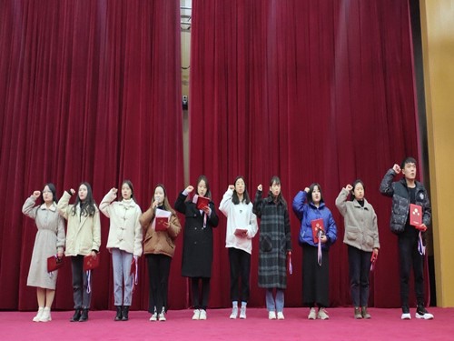 典礼开始前,厅内播放了感恩资助的视频,让学生们切身感受到资助工作的重要性。首先,由信息工程学院(软件学院)党委副书记蔡中民发言,为大家讲解我校的资助政策,鼓励大家积极主动去了解并申请资助项目。随后,由我院团总支书记王玉香和信息工程学院(软件学院)团总支书记买菁菁为最终在两院学生资助宣传大使比赛中脱颖而出的十位选手颁发聘书和奖牌。其中,我院荣获学生资助宣传大使的五位同学分别是朱琳、张伊晓、彭诗佳、李佳楠、李雪璐。两位书记微笑着与他们握手交谈,激励他们为今后资助工作的宣传贡献力量。颁奖完毕,我院李佳楠同学带领两院资助宣传大使进行了就职宣誓。随后,我院资助宣传大使朱琳同学为在座学生朗诵了资助宣传大使倡议书,希望大家懂得资助,相信资助,诚信资助。接着,我院资助宣传大使彭诗佳、张伊晓、李雪璐和信息工程学院(软件学院)的三位学生资助宣传大使依次进行了简单的自我介绍并讲述了自己的年度工作计划。其中,在第二位宣传大使讲解完毕后,我院大学生艺术团表演队的两位队员进行了诗歌朗诵——《祖国啊,我亲爱的祖国》。在第六位宣传大使讲解完毕后,我院进行了诚信校园行校园短剧大赛一等奖的作品展示——19级物流管理一班的《诚信社会需要你》,警醒大家在资助申请的工作上要坚持以诚信为本。最后,本次典礼在同学们的掌声中落下帷幕。