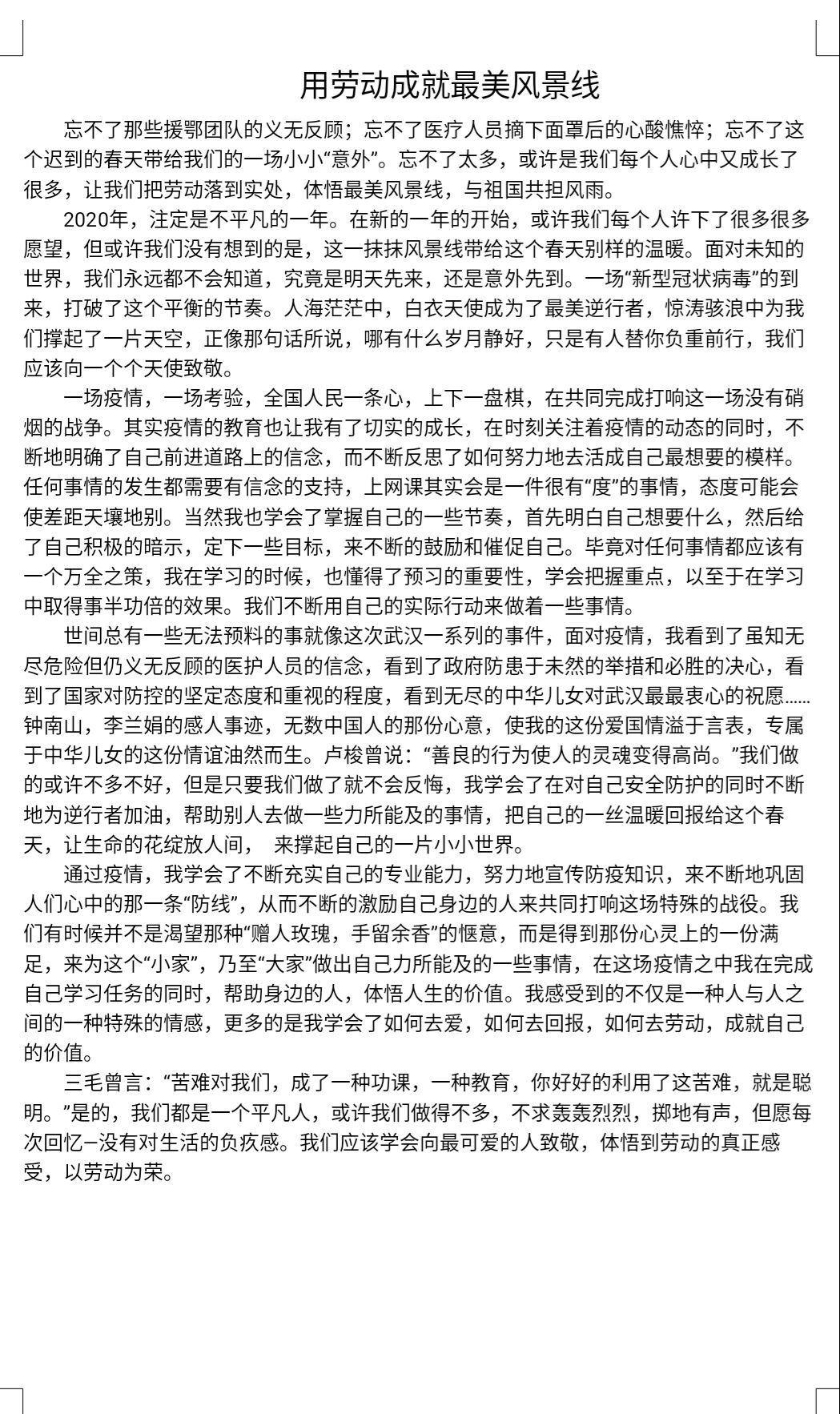 为弘扬劳动精神、抗疫精神,积极营造“劳动最光荣”的良好风尚,培养同学们正确的劳动价值观和良好的劳动品质,鼓励同学们自觉践行社会主义核心价值观。太阳集团tyc234cc积极响应学校号召,于6月23至30日组织开展“劳动的青春最美丽”主题征文活动,引导学生们以文章的形式表达学习《关于全面加强新时代大中小学生劳动教育的意见》的心得体会,学习抗疫精神的感受以及分享假期生活的感悟。