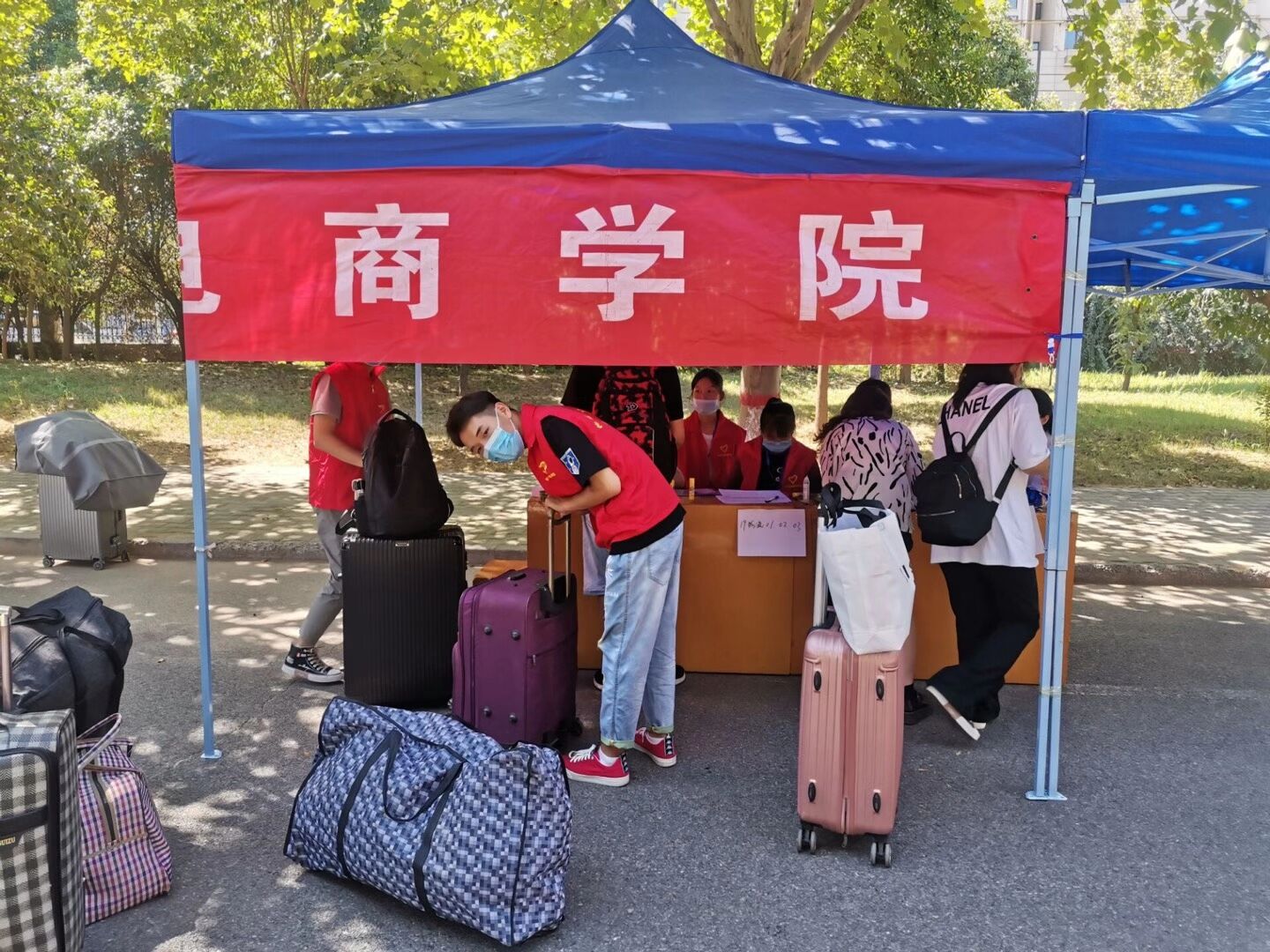 2020年上半年大家一起在家攻克艰难,9月终于迎来我校的开学季,为了学生们在9月4日、5日、6日能顺利安全地入校,我院的各位老师准备了几个星期,开学第一天就在林荫路边支起帐篷为大家办理各项报到的手续,认真消毒。半年未归,同学们也热情未减。我院19级的许多同学都报名参加了以我院团学会社实部为首的“志愿者服务队”,协助老师们完成返校工作,帮大家拎拿行李。