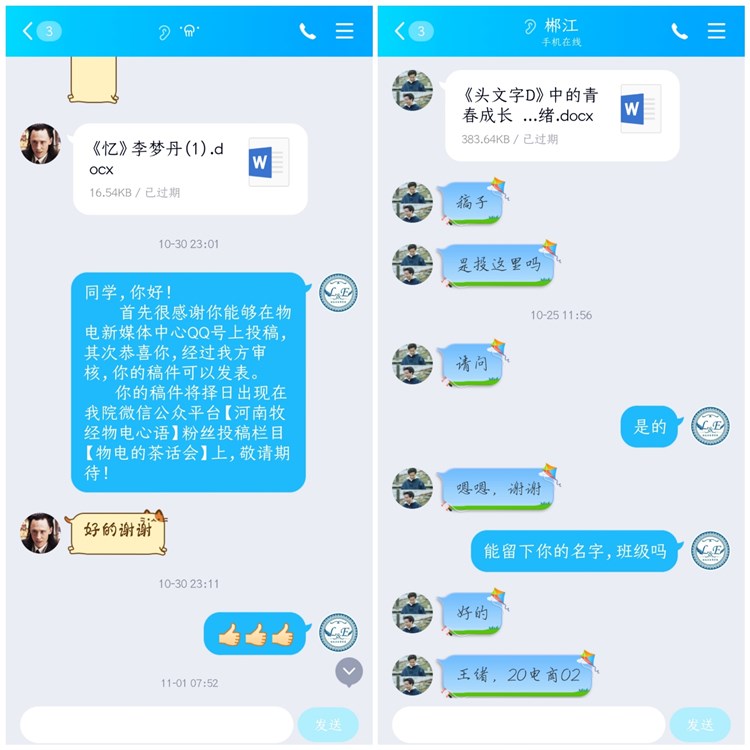专栏投稿的作品内容积极向上,同学们也乐在其中。大家纷纷借此机会分享自己在大学的喜怒哀乐,记录在大学的酸甜苦辣,阐述自己所喜爱的一部电影、一篇美文、一本书籍、一种美食、一段诗词,讲述内心独白,文章犹如溪水,泉源丰盈。活动前期,我院学生以个人为单位以文件的形式发送至我院QQ进行投稿,由新闻部成员进行收取。稿件收取完毕后,由新闻部成员对所有稿件进行筛选和留存,并将审核通过的优秀作品展示在我院微信公众号“河南牧经物电心语”的《物电茶话会》专栏中。