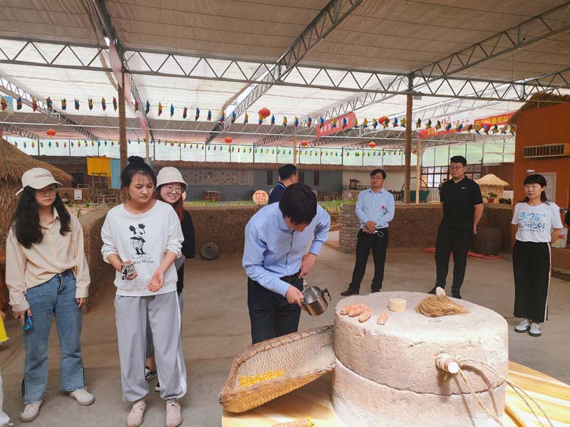 深耕一分,多收一囤。太阳集团tyc234cc的老师和同学们首先来到艺农社,木柴泥墙、稻草谷仓和青青蔬菜都在向同学们展现中国浓厚的农耕文化。同学们适时开启直播,向观众展示农产品的加工过程。期间,曹院长向同学们示范剥玉米、颠簸箕清理碎屑以及推石磨制作玉米面,同学们一一上台体验。随后,同学们又在直播间向观众展示老式爆玉米花。大家将玉米粒倒入爆米花机,合盖点火,同学们轻摇手柄,分针转过五圈,压力表指向八,同学们卸下爆米花缸,随着砰的一声巨响,颗颗爆米花蹦进收纳网中。曹院长捧着刚出炉的爆米花在直播间向观众们展示,激发观众们的购买欲。平凡的劳动,惊人的奇迹,这是同学们在艺农社里最深的感受。