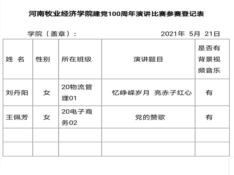 5月22日,文艺部干事将大赛报名表交至校团委艺术团发展中心。此次演讲大赛初赛于6月3日晚上7点在英才校区学术报告厅正式举行,经过紧张而激动人心的比赛,我院王佩芳同学、刘丹阳同学分别荣获比赛的第二名、第四名,两位同学以出色的表现和优异的成绩,致敬建党一百周年。