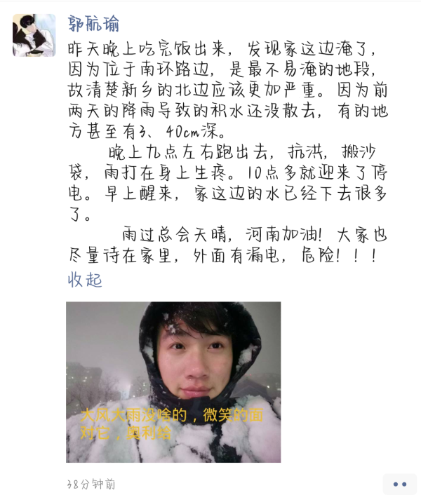 据郭航瑜同学回忆,21日晚上9时左右,新乡市光彩市场附近因暴雨积水突涨,郭航瑜同学响应业主群号召积极前往积水市场,在商户门前垒沙袋防止积水漫入,并将不能碰水的货物进行转移。郭航瑜同学说自愿帮忙的人很多,很快就完成。不止如此,作为班长,加入了新乡救援群的郭航瑜同学积极动员班上学生收集相关求援信息,参与救灾工作。他组织班上同学通过微信、微博、QQ、贴吧等搜集求救信息,一一联系发帖人,跟进救援工作。
