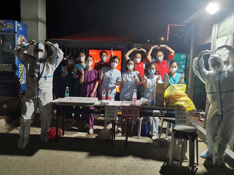 线下,李宁宁同学和志愿者们一起成为核酸检测的后勤人员。小区分楼层分单元分批下楼核酸检测并要求保持一米距离,她帮忙画一米线、搬桌子、支帐篷等。在核酸检测现场,她耐心引导居民进行核酸检测人员信息登记,并用喇叭告知居民检测时的注意事项,提醒大家检测后及时回家,维护现场秩序。同时,她按照楼层号单元号提醒每一户居民下楼做核酸检测,看到医护人员在炎炎夏日中辛苦工作,她用大冰块冰糕给医务人员们降暑。
