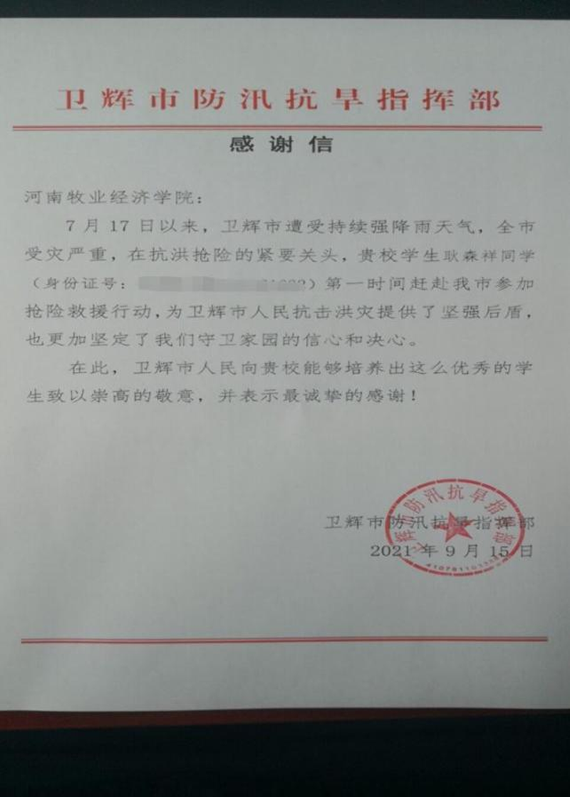 我院耿森祥同学以实际行动践行志愿精神,投身到这场防汛救灾中,他的出色表现得到了卫辉市防汛抗旱指挥部的感谢,充分彰显了大学生的爱心善意和责任担当。