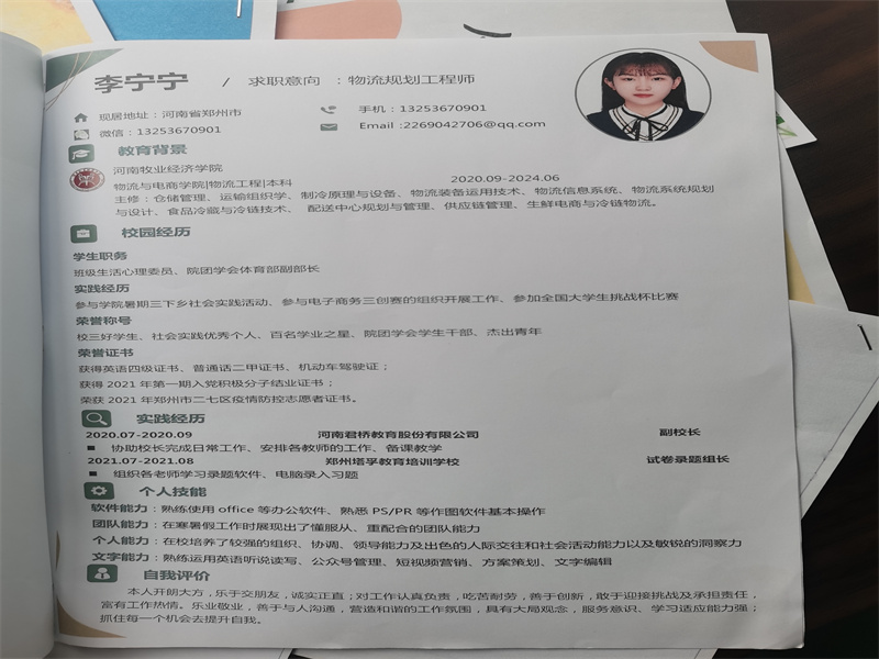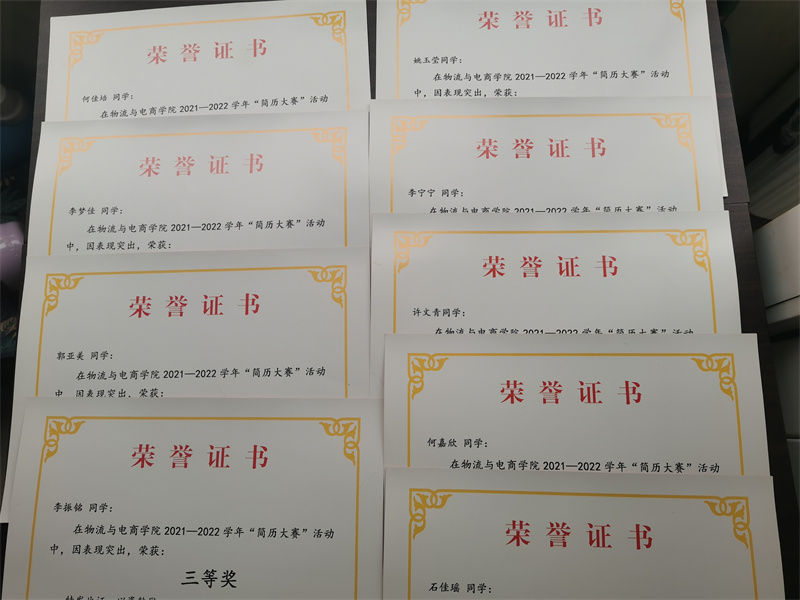 此次简历大赛活动旨在培养同学们的规划思维,帮助同学们明确就业方向、拓展就业空间,增强忧患意识与竞争能力。此次活动从纸质版与电子版两方面增强了同学们对简历的设计、制作能力,让同学们通过亲身参与来发现自身的不足。在简历书中参赛选手从简历的设计规划、制作原则与方法、简历写作的七个法则、简历的构成结构与可写内容等多个方面展开制作,把自我特点和优势通过简历展现出来,在他们的简历中看到他们对职场的憧憬和对未来的向往,同时也让同学们加深了对简历制作的认知,为今后求职积累经验。最终角逐出一等奖一人:何佳培,二等奖三人:姚玉莹、李宁宁、李梦佳,三等奖五人:李振铭、许文青、石佳瑶、何嘉欣、郭亚美。他们在此次活动中脱颖而出,值得我们学习。