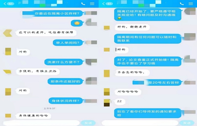 5月5日,学生实习结束从郑州返回安阳滑县,因属地疫情防控要求,须集中隔离14天再返回家中。辅导员杨雪老师知道情况后,第一时间通过电话、QQ等方式与学生沟通,关切地询问了学生目前的身体状况、饮食情况、居住环境等情况,嘱咐学生要严格遵守地方疫情防控要求,以科学的态度正确面对隔离,积极配合医学观察,体现物电人的责任担当。同时,注意居家锻炼,提高身体免疫力,按照要求完成毕业论文,顺利毕业。