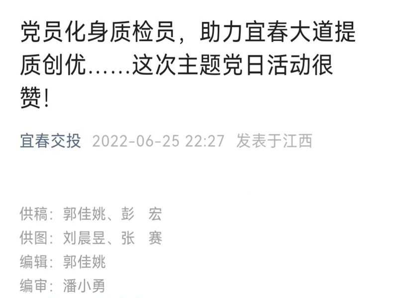 我院20物流管理01的郭佳姚同学暑假在宜春交通投资集团有限公司实习,在岗期间,主要负责公司微信公众号运营、网站运营等,收集投稿并将其编辑后发布,有时候也会参与写稿,在工作过程中,积极学习相关知识,不断提高自身的综合素质。郭佳姚同学表示,在信息宣传岗工作日子,虽然工作很忙,但是非常很高兴能够得到大家的认可,同时也认识到了信息宣传工作的意义。