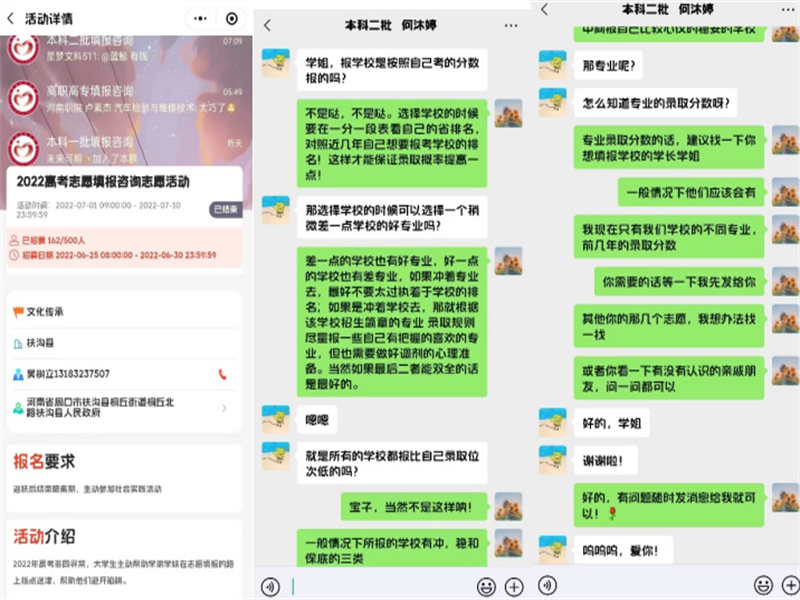 我院21级物流01班的董文鸽同学,在暑假回家后,积极参加了扶沟县志愿咨询填报活动,为学弟学妹的志愿填报提出建议,其主要任务是搜集寻找相关志愿填报的资料,为学弟学妹们给予建议。董文鸽同学表示,在这次志愿咨询填报工作中,她深切的感受到了学弟学妹们对于大学及未来生活的向往与渴望,同时也认识到了志愿咨询填报工作的意义。