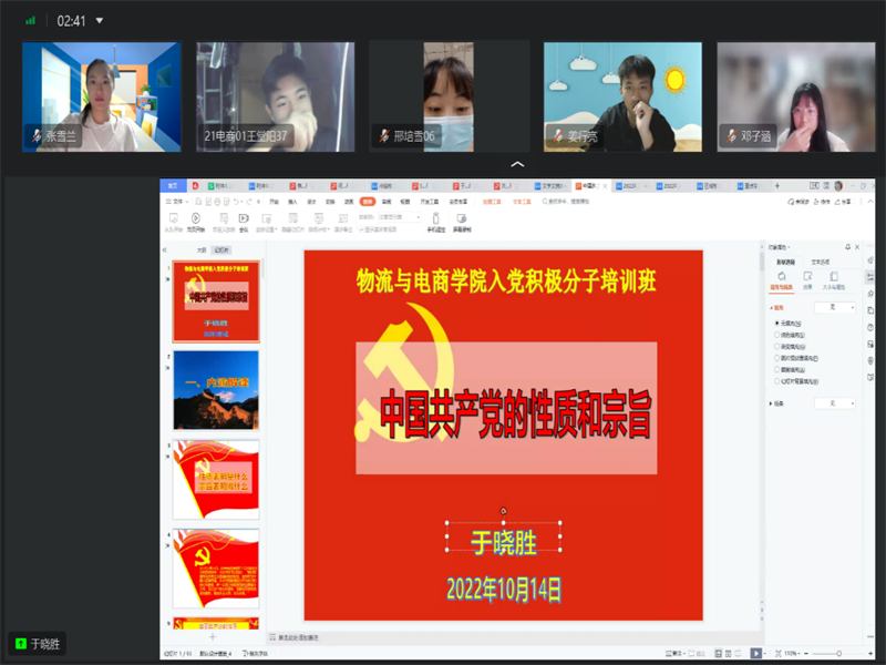 为增强我院入党积极分子的社会责任感和使命感,充分发挥入党积极分子在学生中的模范带头作用,10月14日晚19时,太阳集团tyc234cc在线上开展了以“党的性质、最高理想和根本宗旨”为主题的入党积极分子党课培训第二讲。本次入党积极分子党课由太阳集团tyc234cc党委书记于晓胜授课,2022年第二期入党积极分子参与了此次党课。