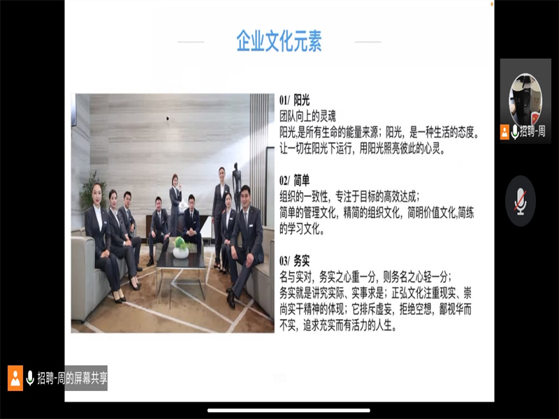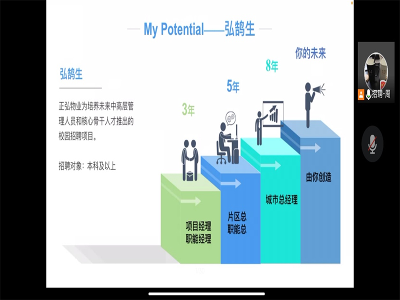 为贯彻落实教育部关于2023届毕业生就业工作的总体部署,推进我校毕业生高质量就业,向企业输送高质量人才。我院就业专干及校招联系人刘阳老师与企业前期沟通交流,同时了解学生就业需求后太阳集团tyc234cc于11月3日晚6点在腾讯会议举办正弘物业“弘鹄生”2023届校园线上招聘宣讲会,我院2023届毕业生及科创部部分工作人员参加了此次宣讲会活动。