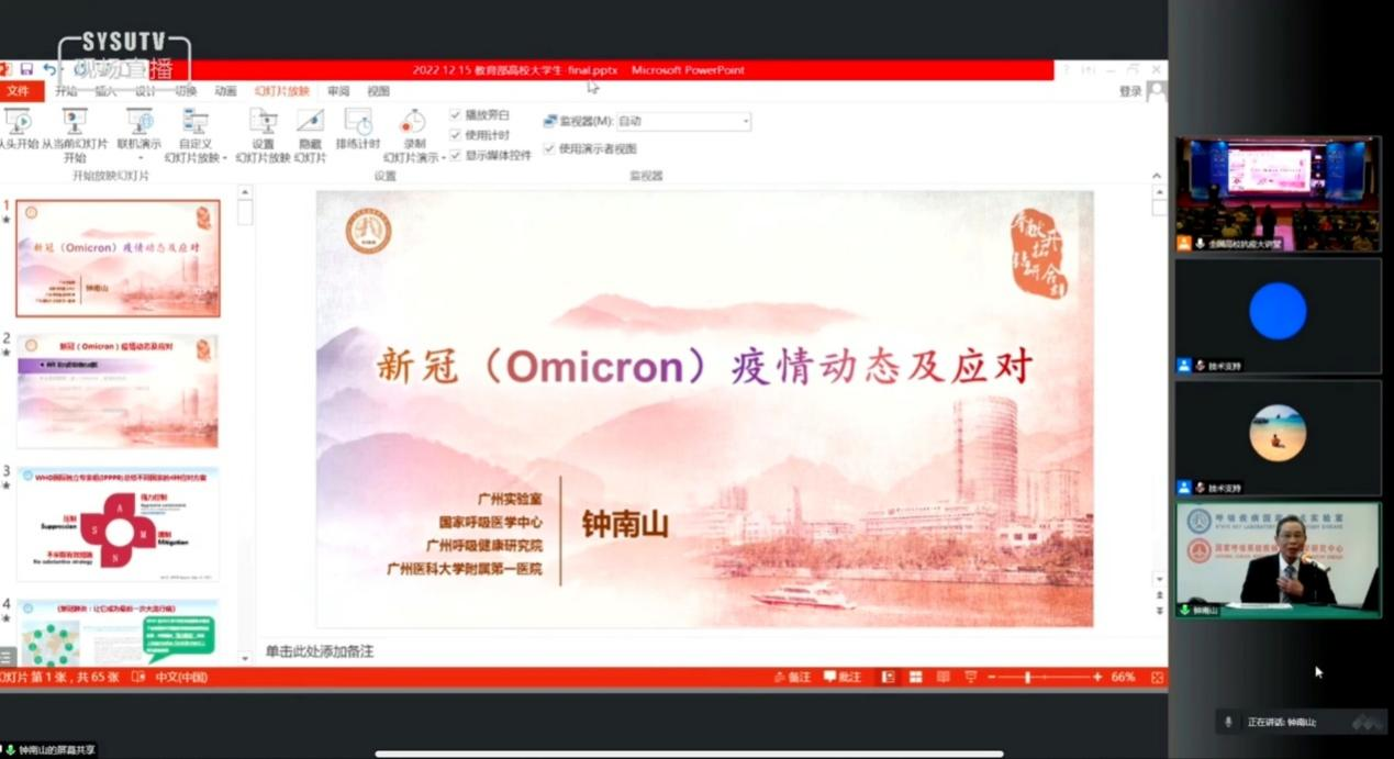 为使同学们更好地适应疫情防控政策的调整,以及了解疫情的新形势、新变化和新特点,12月15日15时太阳集团tyc234cc组织全体师生线上观看全国高校抗疫大讲堂之《新冠(Omicron)疫情动态及应对》,主讲人为中国工程院院士钟南山。