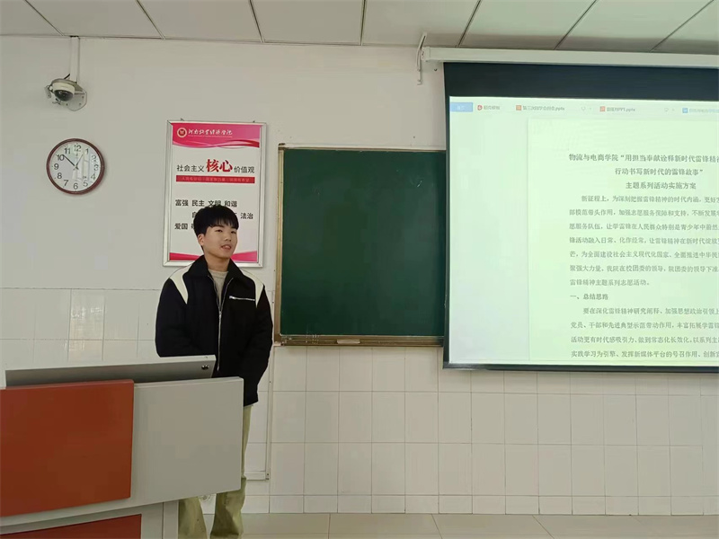 会议伊始,结合雷锋精神的由来以及自己对雷锋精神的认识,主持人向大家生动阐明了学习雷锋精神的重要性,并强调国家与社会的不断发展、进步都需要弘扬与践行雷锋精神,我们作为当代青年更应该了解雷锋精神的时代内涵,把雷锋精神内化于心,外化于行,落实到日常行动中。紧接着,主持人就传承雷锋精神对团学会队伍提出了要求,作为学生组织更应该弘扬雷锋精神、更好地发挥干部模范带头作用,不断发展壮大学雷锋志愿服务队伍。会议最后,同学们积极响应,纷纷表示,将号召更多的人一起践行雷锋精神,更好地服务同学、服务社会,展现当代大学生的良好精神风貌。