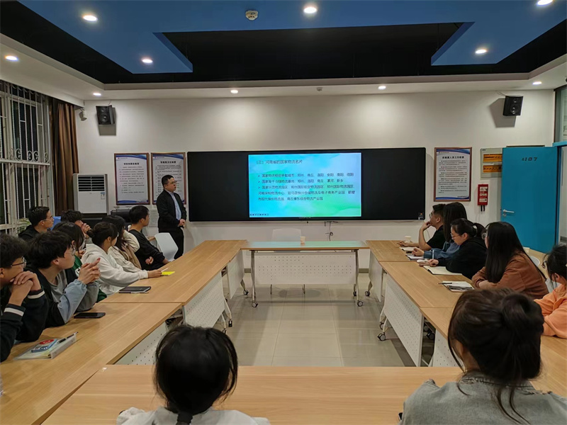 会议开始,秦学长介绍了自己的工作情况,担任河南省物流与采购联合会现代物流信息中心主任,主持郑州市、洛阳市等社会物流统计工作等等。然后秦学长回忆自己在学校里的学习经历,获得过诸多荣誉,同时他也鼓励同学们努力学习,在学校里多参加一些比赛,丰富自己的校园生活,同时也能磨炼自己。接着秦学长以自己工作内容为切入点,对河南省物流发展状况进行了详细的介绍和分析,让在座的各位同学对河南省物流行业有了初步的了解,提高同学们学习的信心与动力。在介绍河南省物流发展的时候,秦学长以四条丝绸之路为中心,生动的表达出河南省物流发展欣欣向荣的趋势。随后,秦学长又细心地给同学们解释物流管理专业的学生就业的方向和领域以及就业的前景,帮助同学们增加学习物流专业的定力,同时学长也给同学们指出关于物流专业所需要的能力,怎样使自己在就业时更有竞争力,并结合自身大学经历,给予同学们考证及参加竞赛的建议。