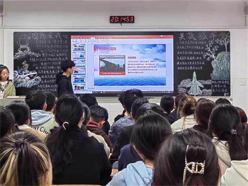 团课伊始,各班同学在团支书的带领下,重温了抗日战争的艰苦岁月,了解了中华民族英勇抗击日本侵略者的伟大历程。一张张图片、一个个事迹,让同学们的内心深受触动。同学们也深深认识到:只有国家强盛,才能彻底避免任人宰割的命运;只有民族团结,才能凝聚成战胜一切困难的力量。团课过程中,有同学以“迈向强国新征程,军民共筑强军梦”为主题,从什么是国防、我国国防的性质是什么和全民国防青少年应该做什么三个方面进行宣讲,并通过形象的比喻和问答的方式,加深学生们对国防含义的理解,同时,通过举例帮助同学们了解我国日益增强的军事实力。他们表示,作为当代青年大学生,应不负时代韶华,为实现中华民族伟大复兴的中国梦而努力奋斗。
