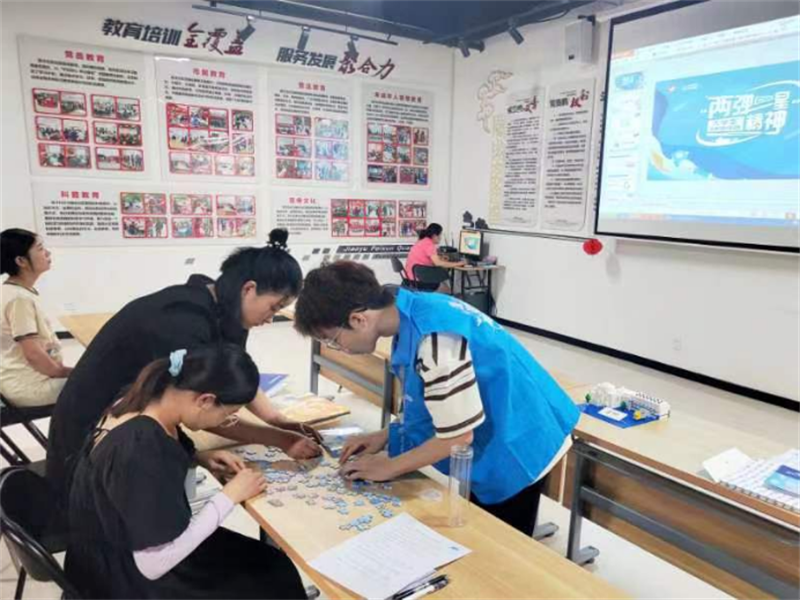 在活动中,为了深入了解居民群众对“两弹一星”精神的了解程度,宣讲团组织大家填写了相关调查问卷。随后,宣讲团的全体成员又带领大家观看了关于“两弹一星”精神的宣传手册——《中国核电》等,旨在提高公众对于“两弹一星”精神的了解和认知。在活动中,大家表现出了极高的积极性,伴随着大家的热情,阳光青年志愿宣讲团和大家一起,通过“核小U漫游中核”跳棋游戏、“华龙一号”拼装模型拼图游戏、趣味知识答题等一系列活动,增强了大家对国家科学技术的认知,激发了青年学生的学习兴趣和职业发展意愿。活动最后,为加深居民对“两弹一星”精神的感受,阳光青年志愿宣讲团采访了居民对“两弹一星”精神的理解,居民们纷纷表示,通过今天的活动,了解了“两弹一星”精神的背景、意义和成就,增强了对国家核武器和航天技术的了解。