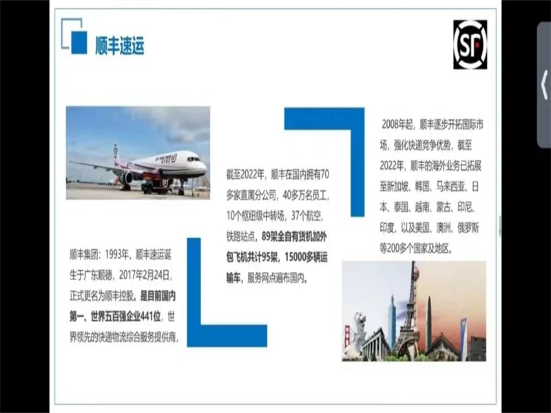会议伊始,顺丰速运人力资源负责人刘女士为同学们播放了企业宣传片,向大家展示了顺丰集团的发展历程和企业文化,让同学们对企业有了初步的了解。随后,刘女士通过PPT向同学们更加全面地讲解招聘岗位、公司工作环境、宿舍环境、工作时间、企业文化以及企业活动,并且提供实习生宿舍及每天10元的出勤餐补。工作地点在浙江杭州一带,入职三个月以后,可报销200元的体检费,对于离家较远的同学报销最高可达700元的路费。对有意愿加入顺丰的同学,顺丰公司将会提供广阔的晋升通道以及经验丰富的老师手把手指导。对于休息和福利方面,公司有雄厚的条件提供丰厚的福利和充裕的假期,还有饱含企业特色的节日福利、社团活动以及员工活动,以丰富员工的生活。