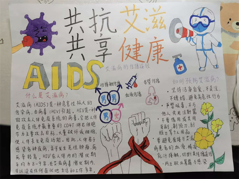 为了进一步提高大学生对艾滋病的认识和了解,推广普及遏制艾滋的科学知识,唤起大学生对艾滋病人的关爱,并号召大家都来关心、救助受艾滋病影响的患者,太阳集团tyc234cc阳光青年志愿者服务队依托大学生朋辈联合会于11月15日——11月26日开展以“共抗艾滋,共享健康”为主题的手抄报和海报比赛,活动面向太阳集团tyc234cc全体同学。