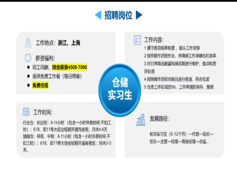 菜鸟物流校招负责人张女士为同学们讲到,菜鸟物流是电商物流行业的全球领导者,并通过PPT展示了菜鸟物流从2013年5月建立菜鸟网络直至现在成为电商与物流行业的全球领导者的辉煌,是持续化跨越发展历程,以及从菜鸟业务、菜鸟供应链、基础资源、行业荣誉等方面深刻介绍了菜鸟物流,让大家对菜鸟物流有了更深入的了解,并增强了同学们加入菜鸟大家庭的热情。之后,张女士呼吁同学们集中注意力关注校招岗位部分,本次校招岗位为仓储实习生,主要负责运转维护和快件管理等相关工作,工作地点在上海和浙江的部分城市,工作内容主要分为行业仓和猫超仓。薪资及食宿方面,实习生综合薪资在4500-7000每月,食堂饭菜种类丰富,住宿一般以六人间为主,配套设施完善,并且节假日会有节日礼包,福利丰富。晋升方面,入职6-12月期间会有晋升机会,通过完整的培养通道,步步晋升。对于有意向进入菜鸟大家庭的同学,张女士表示先到先得,即按报名顺序进入线上面试及入职培训。会议最后张女士耐心等待同学们提问问题并悉心回答。