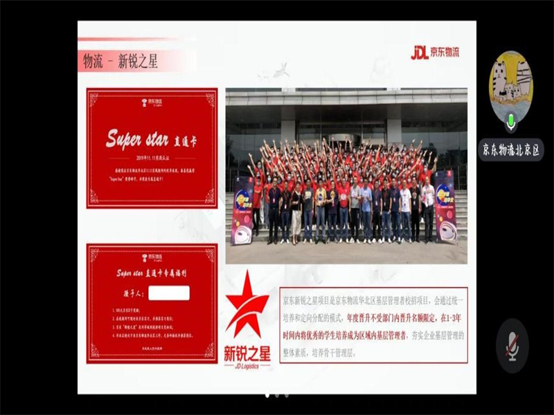 为进一步加强校企合作,在毕业生和用人单位之间搭建双向选择的平台,提供更优质的服务,切实做好学生就业工作,经过我院就业专干和校招联系人尚津老师前期的交流沟通,了解毕业生的需求后,于11月29日晚19时举办京东物流华北区线上宣讲会,2024届部分毕业生与团学会就业资助部全体成员参与此次宣讲会。
