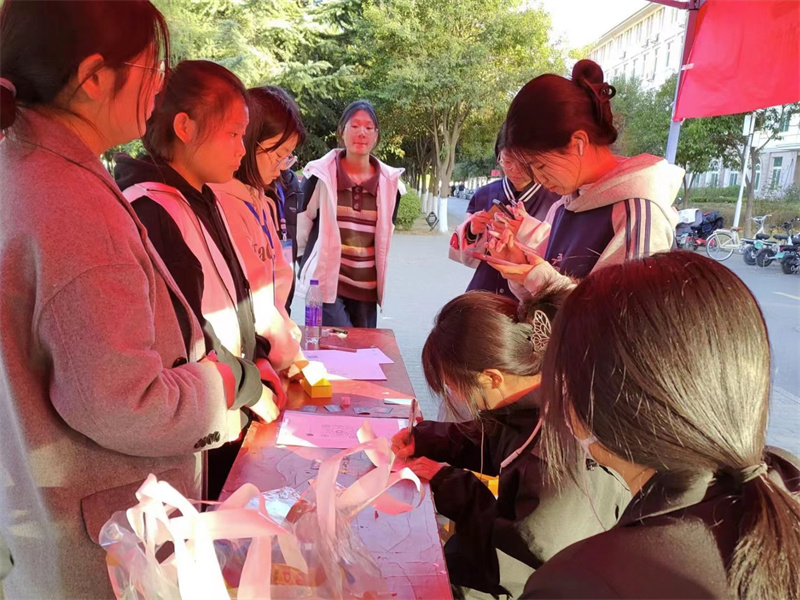 活动开始前,活动组织者在红色花蕊处搭建了帐篷,为参加活动的同学准备了活动工具。在组织者的呼吁下,不少同学参加了本次活动,对活动充满热情。参加本次活动的同学在明信片上写下对考研同学的祝福,由本次活动的组织者收集,并送给下一位考研同学。通过这样进行接力,将祝福送给每一位同学,祝福是对自己的祝福也是对每一位同学的祝福。在收集考研同学的祝福语时,我们会将提前准备的精美礼物送给他们。同时由工作人员将准备的礼物和祝福语一同送给在图书馆学习的考研同学,将这次活动的心意送达。精美的礼物和祝福语是同学们对考研的重视,也是对考研同学的美好祝愿。