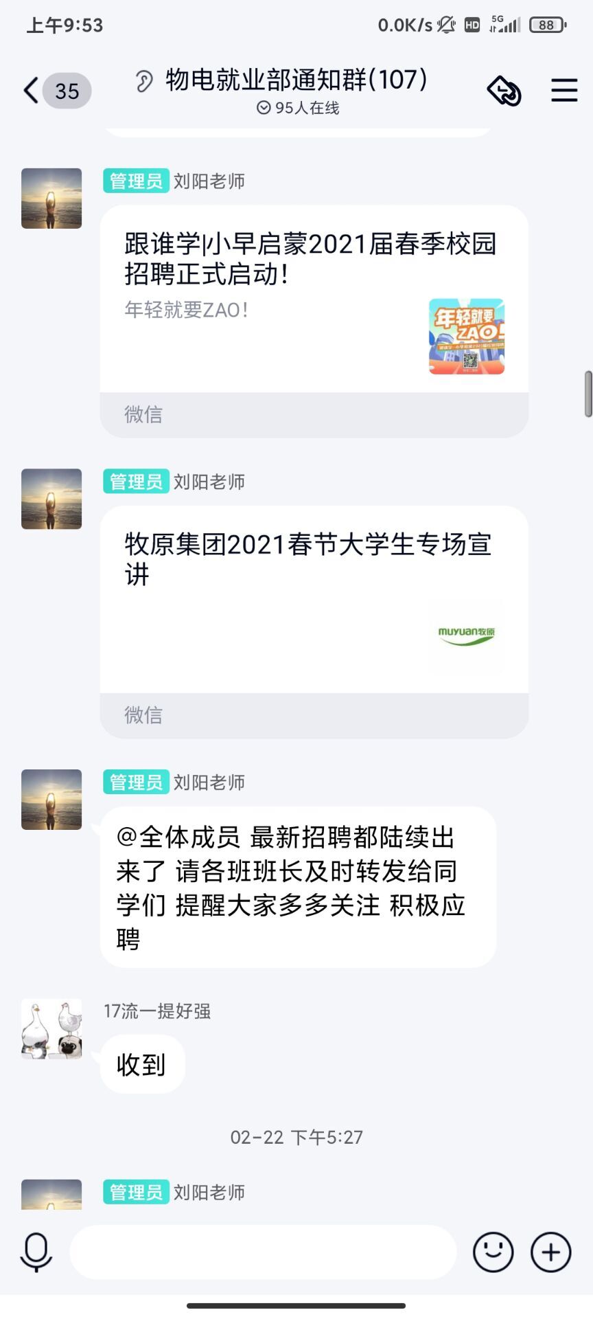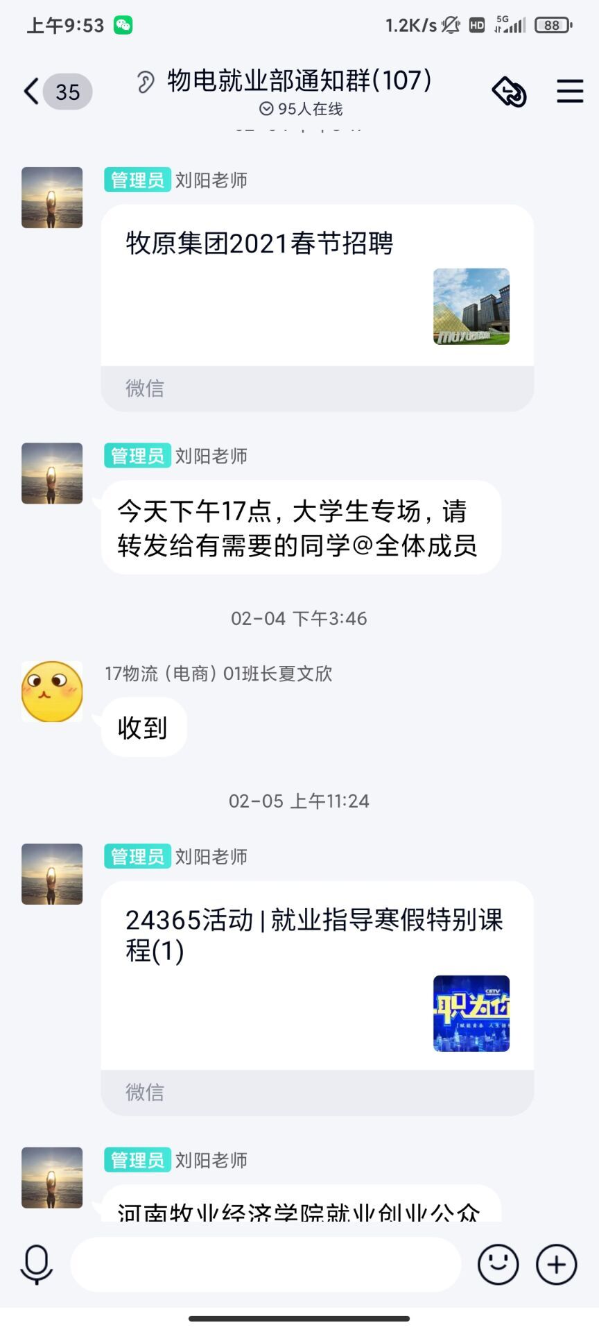 首先企业下达招聘信息后,由我院工作人员接收整理并发布于太阳集团tyc234cc就业通知群中,2月份推送有牧原集团、跟谁学小早启蒙、高徒课堂以及郑州市卓轩电子科技有限公司等优秀企业的2021春季招聘信息,并依次发布介绍了企业的人才发展方向、工作要求、福利待遇等信息。在接收到招聘信息后,毕业生们根据自我定位以及薪资福利等自主选择招聘群进行进一步咨询了解。除此之外,就业专员刘阳老师对招聘信息进行审核筛选,以便帮助同学们进一步明晰行业的就业优势以及未来努力的方向,并在QQ,微信以及就业通知群中热情回答了同学们对就业创业等方面提出的疑惑问题。此次二月份发布的企业招聘信息给我院毕业生提供了大量优质岗位,彰显了我院就业工作在假期期间也不放松,依旧提供优质的就业信息,完善提高就业服务的工作态度。同时,我院就业专员通过不断转发一些优质实用的面试技巧,怎样提升简历撰写能力吸引面试官眼球,明晰自我就业方向以及奋斗目标等相关资讯以及信息来帮助毕业生提高在面试等环节的通过率。