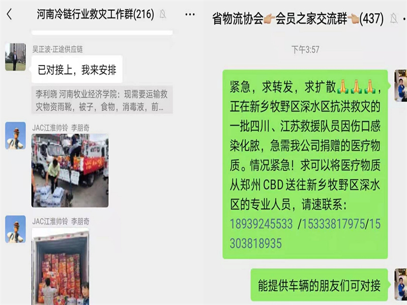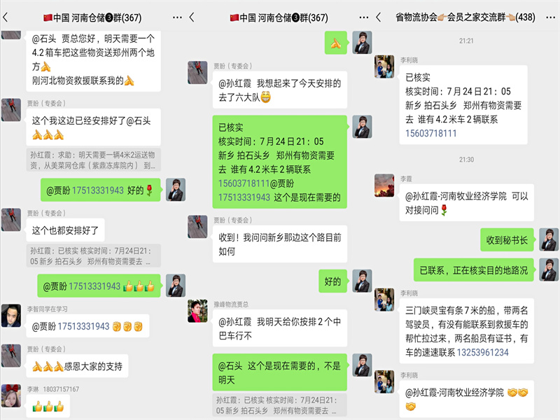洪灾前,李利晓老师和孩子就已身在外地,看到郑州受灾,朋友圈和微信群里发的洪灾信息,却帮不上忙,心痛不已。当她了解到自己的老师能够对接物资车,就及时将需要运输车的消息转发给了河南省物流协会的秘书长李霞,由她转发至群中。就这样许多信息很快对接成功,李老师非常开心,立刻向群中分享能够对接救灾物资运输车的消息。同时,李利晓老师还加入了郑州市惠济志愿者群、同学组织的捐赠队群、物流协会群、冷链抗灾工作物流群等等。她表示,每当大家有需求,将信息发至群中或私聊她时,她都很热心帮助每一位求助者。李老师说:“咱们物流人有大爱,都能快速对接成功,把物资及时准确地送达目的地。尤其有一车医疗物资,负责人能够在群里自动对接到一辆冷藏车,专业又高效”。虽然李老师因火车停运无法归家,但她的爱心和热情已经传递在灾区的数个角落。