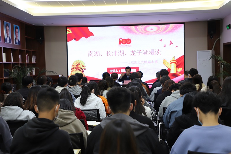 党史学习教育启动以来,学校领导班子成员围绕党史学习,结合工作实际,着眼发展新局,面向师生讲授思想深刻、富有实践指导意义的党史学习教育思政课。为把学习党史同深刻领悟习近平新时代中国特色社会主义思想贯通起来,10月21日下午3时,姚毅校长以“南湖、长津湖、龙子湖漫谈——让党史之光照耀未来”为题,在图书馆一楼会议室为太阳集团tyc234cc师生讲授了一堂有高度、有深度、有情怀、有温度的党史学习教育思政课。太阳集团tyc234cc党委副书记陈永刚、团委副书记王雪冰、全体辅导员及部分学生干部参加。
