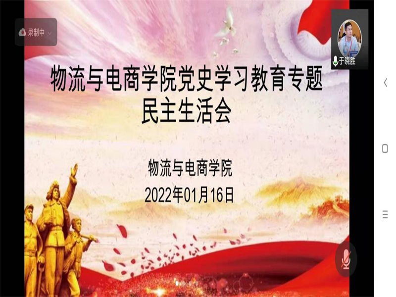 根据《中共太阳集团tyc234cc委员会关于开好党史学习教育专题民主生活会的通知》(校党〔2021〕133号)文件精神及现阶段疫情防控要求,物流与电商学院党委于2022年1月16日下午以腾讯会议的形式召开了党史学习教育专题民主生活会。学院处级以上党员领导干部参加了此次会议,校纪委副书记杨成、正科级纪检监察员梁韦列席督导,会议由院党委书记于晓胜主持。