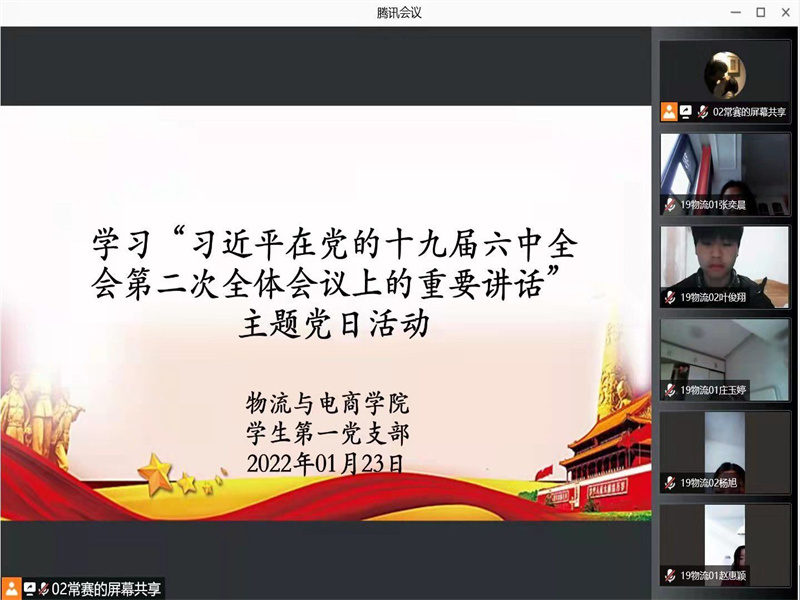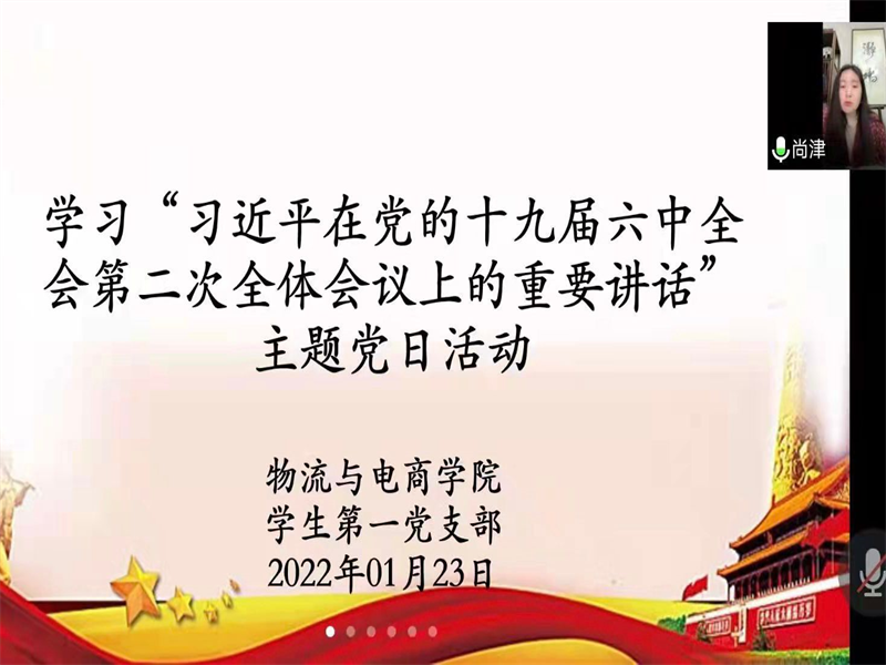 为巩固好党史学习教育的成果,太阳集团tyc234cc学生第一党支部于1月23日下午17:00通过腾讯会议在线上开展了以“习近平在党的十九届六中全会第二次全体会议上的重要讲话”为学习内容的的主题党日活动,学生第一党支部书记尚津、第一党小组组长王雪冰和全体在校学生党员参与此次会议。