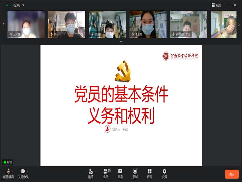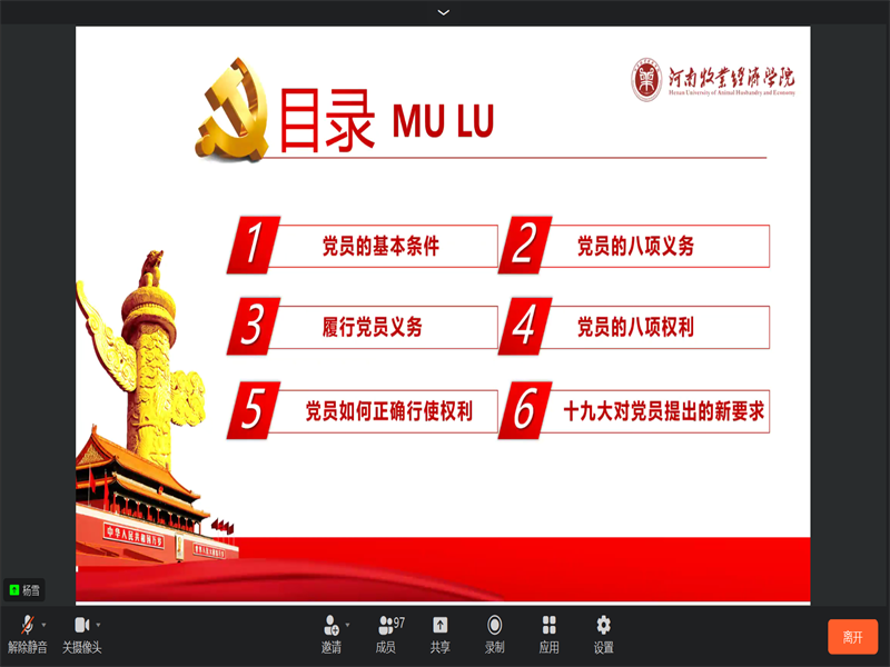 为提高我院入党积极分子的党性修养,增强其对党员条件、义务和权利的认知,太阳集团tyc234cc于10月16日下午3时在钉钉视频会议开展了以“党员条件、义务和权利”为主题的入党积极分子党课第四讲,学生第三党支部书记杨雪老师出席了本次党课活动,全体2022年第二期入党积极分子参与此次培训。