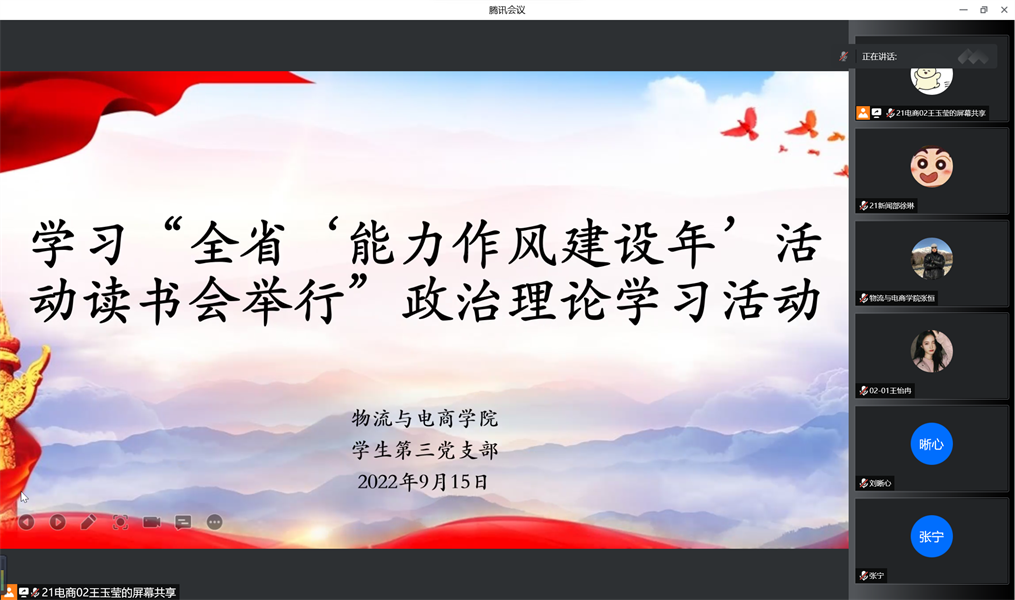为深入“学习习近平总书记重要讲话精神,迎接党的二十大”专题研讨班上发表的重要讲话,2022年9月15日晚上19时,太阳集团tyc234cc学生第一党支部通过腾讯会议形式开展了以“学习习近平总书记在庆祝中国人民解放军建军90周年大会上的讲话”和“河南省‘能力作风建设年’活动读书会举行”为学习内容的政治理论学习活动。支部书记尚津老师和学生第一党支部全体在校生党员参加了此次活动。