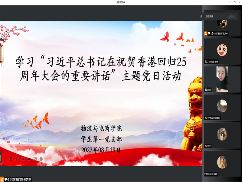 为庆祝香港回归祖国25周年,激励党员大力弘扬伟大建党精神,凝聚强大奋进力量,太阳集团tyc234cc学生第一党支部于8月19日晚19时通过腾讯会议线上召开了七、八月份主题党日活动。支部书记尚津老师和学生第一党支部在校生党员出席此次会议。