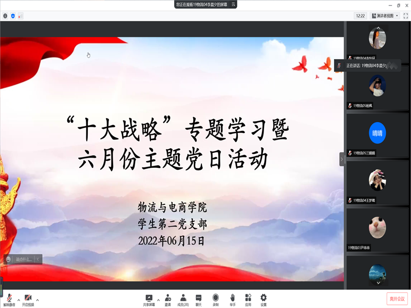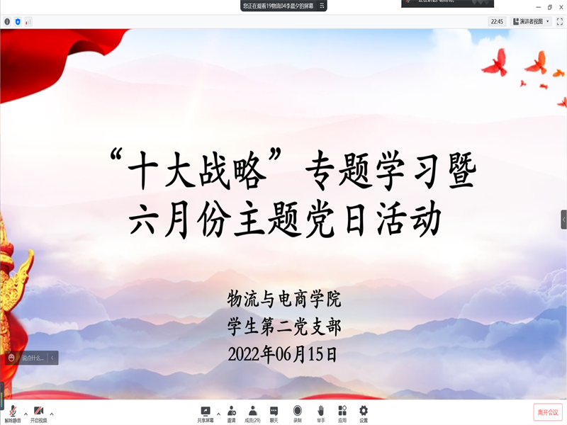 按照校党委《关于组织党员进党校学习“十大战略”的通知》校党【2022】22号文件及《关于开展2022年6月份党支部主题党日活动的通知》的要求,结合“能力作风建设年”活动的开展,太阳集团tyc234cc学生第二党支部于6月15日11时在线上通过腾讯会议召开了“十大战略”专题学习暨六月份主题党日活动。学生第二党支部书记刘阳老师、组织委员张排杰老师,党小组长杨奇奇老师及学生第二党支部19级在校生党员出席此次会议。