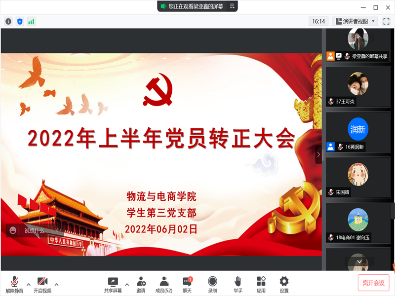 依照党员发展流程,结合我院党员发展实际,太阳集团tyc234cc学生第三党支部于6月2日下午16:00分通过腾讯会议召开了2022年上半年党员转正大会。支部书记胡可鑫老师、组织委员杨雪老师及学生第三党支部在校生党员和应届毕业生党员出席此次会议。