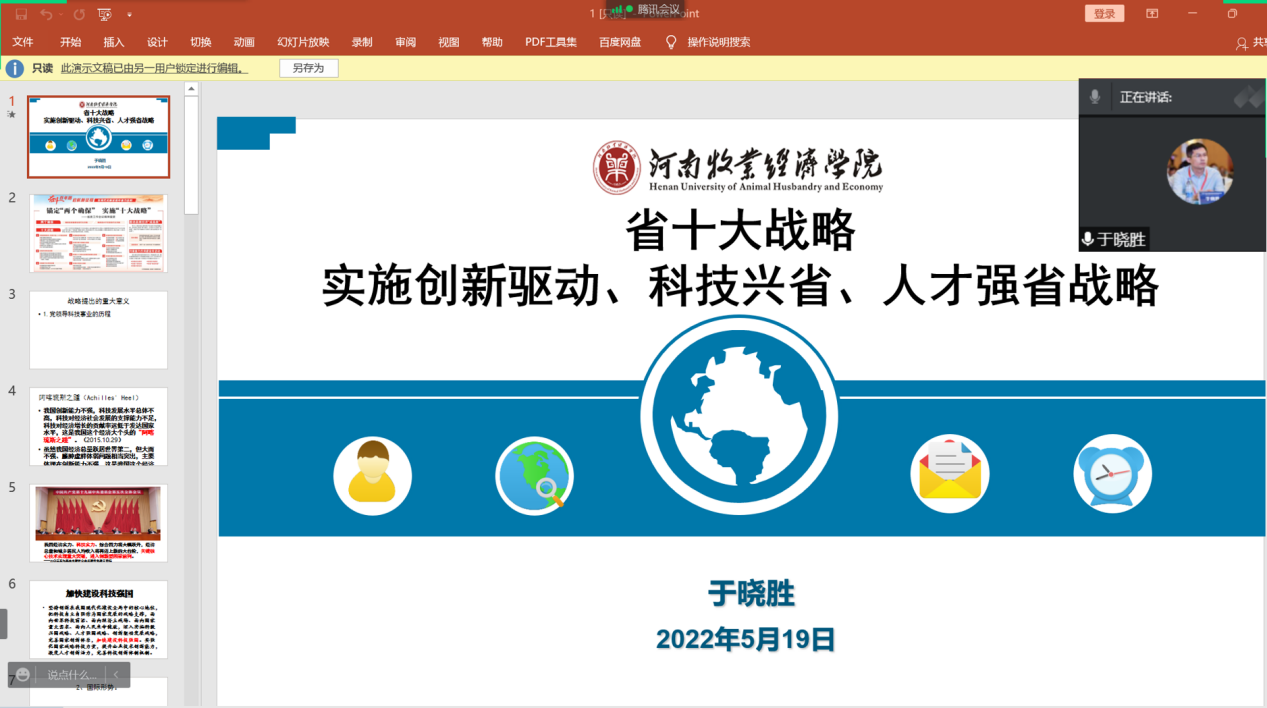 于书记首先解读了十大战略提出的重大意义,并从国际、国内形势两个维度深入分析了树立世界科技强国奋斗目标的重要性,然后结合河南本地详细解读了河南省实施创新驱动、科技兴省、人才强省战略的七个方面的路径,最后从学术诚信、人才项目申报、聚焦目标方向对各位党员同志提出了建议和忠告。