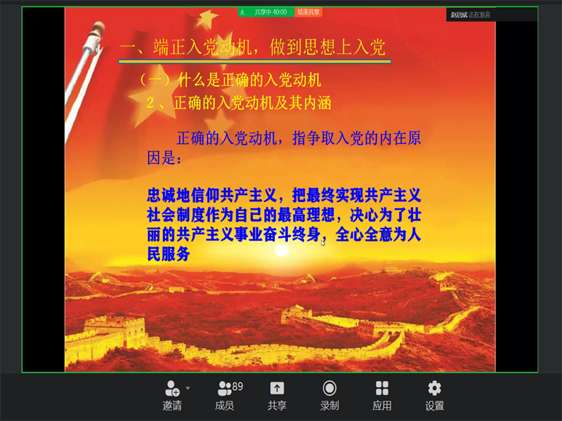 为增强入党积极分子对党的进一步认识,坚定积极分子追求党组织的决心,结合疫情防控要求,太阳集团tyc234cc于10月19日19时在线上开展了以“端正入党动机,争做合格党员”为主题的入党积极分子党课培训第二讲。太阳集团tyc234cc正处级组织员赵启斌老师作为授课人出席本次入党积极分子党课,2022年第二期入党积极分子参与此次培训。