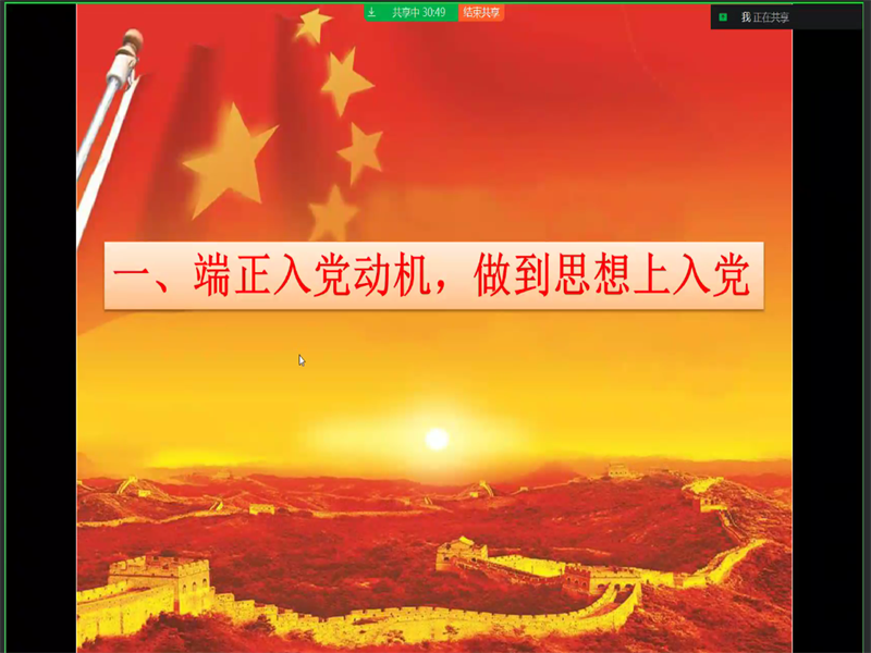 会议伊始,赵老师从什么是正确的入党动机、为什么要端正入党动机、端正入党动机的途径三方面阐述了端正入党动机的重要性,并强调要有为共产主义和中国特色社会主义事业奋斗终身的坚定信念,要有为全心全意为人民服务的思想和在生产、工作、学习和社会生活中起先锋模范作用,运用习近平总书记的讲话说明理想信念是共产党人的精神之“钙”。接着,赵老师列举毛泽东、钱学森等共产党员讲述正确的入党动机是正确行动的精神力量,只有端正入党动机,才能经受住党组织的考验。