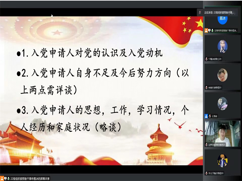 为了进一步了解入党申请人的党性修养和思想觉悟,增强其对党的认识,帮助其端正入党动机,在遵守疫情防控要求的前提下,物流与电商学院学生第一党支部于10月24日下午16:30在腾讯会议上开展了2022年下半年同入党申请人谈话会议,太阳集团tyc234cc学生第一党支部书记申作光出席了本次会议,学生第一党支部49名入党申请人参加了本次会议。