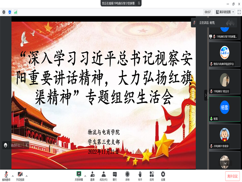 为了深入学习习近平总书记视察安阳重要讲话精神,大力弘扬红旗渠精神。11月21日中午12:20,太阳集团tyc234cc学生第三党支部通过腾讯会议在线上开展2022年下半年组织生活会本次会议由宣传委员张宁主持,学生第三党支部书记杨雪老师及学生第三党支部全体在校生党员参加了此次会议。