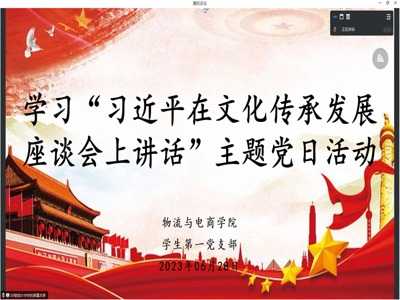会议伊始,宣传委员华宇同志系统领学了本次主题党日活动的主题内容,并就本次主题内容发表了自己的看法与感悟。随后,梁亚鑫、刘丹阳、周梦丽等在校生党员也分享了自己的思考,他们引用了习近平总书记的重要讲话“中华优秀传统文化有很多重要元素,共同塑造出中华文明的突出特性”,表示要深刻感悟中华文明的博大精深,坚定文化自信,走好自己的路,始终保持文化自信的强大底气,以社会主义核心价值观为引领,认真学习社会主义精神文明。最后,尚老师做出总结发言,首先对几位同学的发言做出了肯定,并针对几位同学的发言表示,正值暑假期间,希望在座的在校生党员能充分利用假期充实自己,认真学习贯彻社会主义精神文明,努力发挥党员的先锋模范作用。
