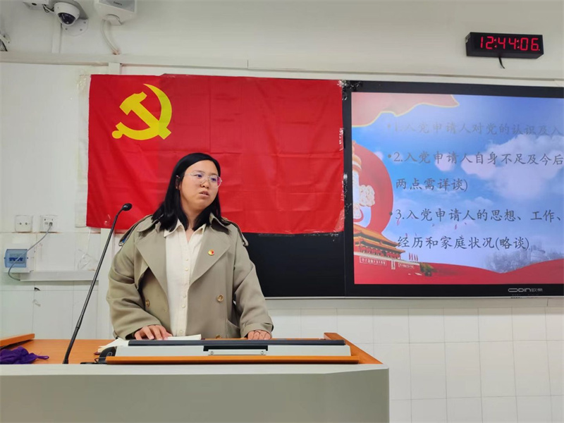 会议伊始,入党申请人首先对自己的个人情况、家庭情况、对于党组织的认识以及自身的入党动机等问题进行发言。各位入党申请人在发言阶段都表现出了诚恳的态度,对自己的个人情况都做出了比较全面的总结,道出了自己的优势与不足,以及积极改进的决心。入党申请人简要介绍了自己的家庭情况,包括家庭成员、家庭背景等等。当谈到自己对于党组织的认识时,各位入党申请人更是展现了自己对于党组织的充分认识以及对于党组织的向往与敬畏。在谈到入党动机时,入党申请人都以实事求是的态度做出回答,说明了自己目前能力的不足并表示自己在未来会努力提升自我能力,以一个先进党员模范的标准来要求自己,在行为举止方面约束自己,并且努力学习理论知识,提升自己的理论修养,加深对共产主义事业的认识。在会议的最后,张老师作出总结,提出对各位入党申请人的期望与要求,希望他们可以端正自己的入党动机,在生活中落实对自我的要求,积极学习理论知识,不断提高自己的思想水平,争取早日入党!