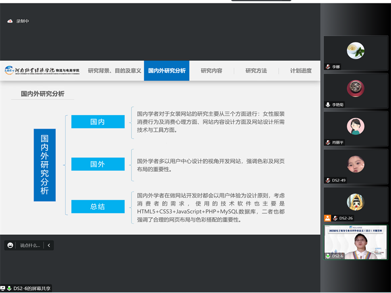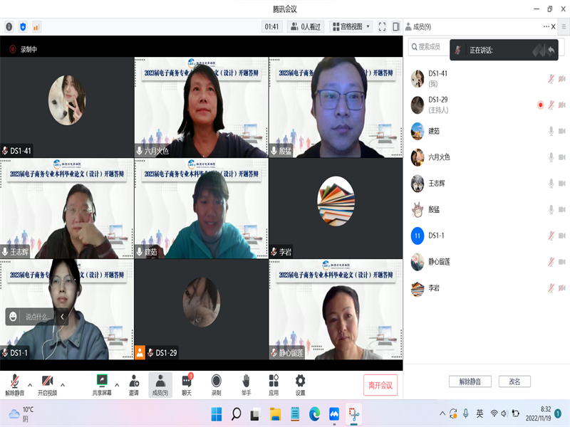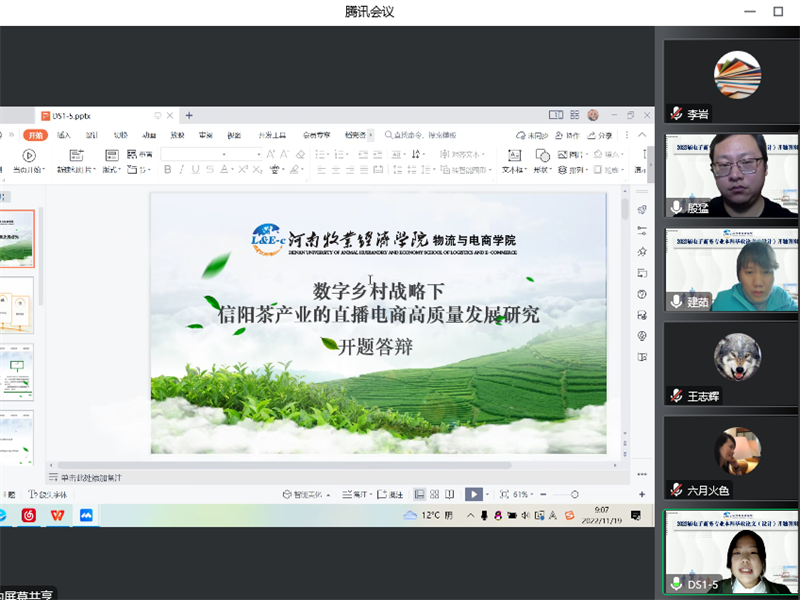 2022年11月19日,物流与电商学院通过腾讯会议举行了2023届电子商务本科专业毕业论文(设计)开题答辩,本次答辩会共计110名本科毕业生,分两个小组进行答辩。答辩小组组长分别由电子商务教研室主任殷猛博士、电子商务实验室主任肖丽平博士担任。