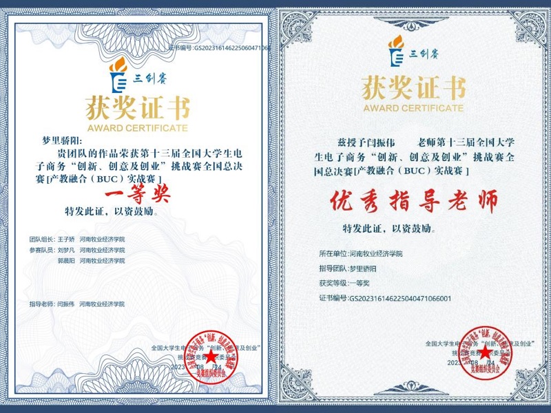 2023年7月20日-7月22日,由全国电子商务产教融合创新联盟主办、湖北经济学院承办的第十三届全国大学生电子商务“创新、创意及创业”挑战赛(以下简称“三创赛”)全国总决赛在湖北经济学院成功举行。我校太阳集团tyc234cc闫振伟老师带领“梦里骄阳”团队获得国赛一等奖。
