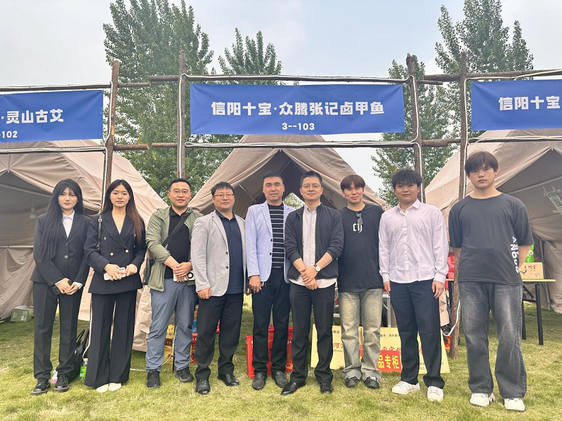 29日上午,调研团队首先参加了信阳市第三十二届信阳茶文化节,品茗话电商,了解信阳毛尖的历史和文化,调研了信阳毛尖在不同渠道的销售情况,关注了茶文化节中“信阳十宝”等系列特色产品,重点调研了众腾张记卤甲鱼等信阳市潢川县的农特产品。众腾张记卤甲鱼展位负责人向我们介绍了他们甲鱼直播电商的销售情况,并希望学生能够利用课余时间参与到农特产品的传播和销售中。