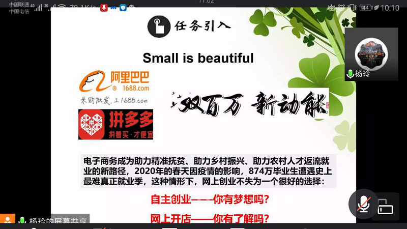 2020年5月9日上午,我院电子商务教研室的杨玲老师开展了《电子商务概论》线上教学观摩课,我院领导及无课教师全程在线观摩教学。