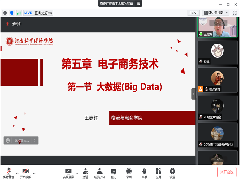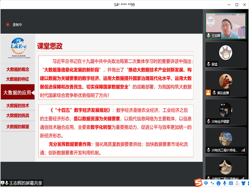 王志辉老师本次示范课的授课主体为20物工01、20物业01的同学。王老师在课前提前告知同学们此次课程的学习目标,并安排课前预习、收集资料等任务,促使学生带着问题来学习。在课堂开始时,王老师通过学习通平台进行签到,保证了课堂100%的出勤率,并运用学习通平台的进行主题讨论,提取词云,及时检查学生资料收集情况与已有知识建构。王老师分别从大数据的概念、特征、应用、技术、挑战、展望等方面进行详细讲授,期间通过课堂讨论、提问等形式引入学生到深度学习,期间巧妙融入课堂思政元素,学教并重。在课程最后,王老师再次通过学习通平台进行课堂测验,及时检查学习效果,并布置课下学习任务,有效延长学习时间。王老师的课堂讲授准备充分,内容丰富,课件精美,思路清晰,语言富有感染力,师生互动良好,能够启发和鼓励学生思考,同时又充分体现了授课教师自身的鲜明特点,充分展示了我院优秀青年教师的教学风采。