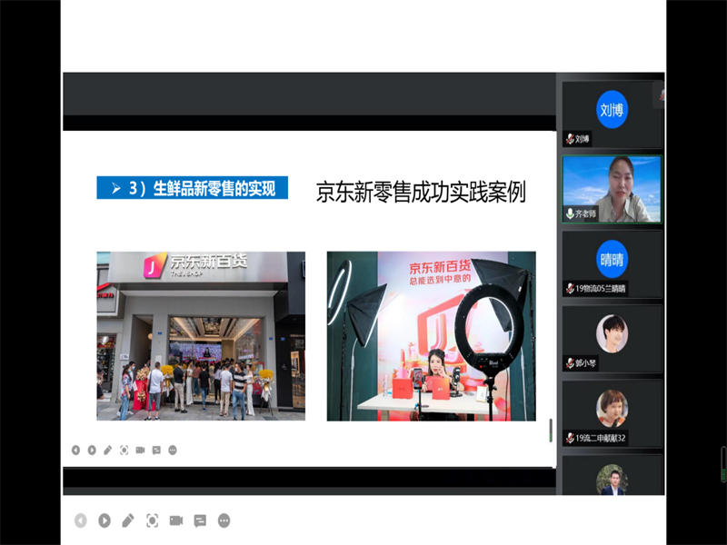 齐云英老师本次示范课的授课对象为19物流01、02班的同学。齐老师在课前提前告知同学们此次课程的学习目标,并安排课前完成MOOC上视频教学资料学习,学生通过自主学习初步掌握了相关理论知识。在课堂教学开始前齐老师先通过提问及互动的方式检查学生课前学习情况与已有知识建构。在授课过程中重点采用案例教学的方法,以京东新零售实践案例贯穿课堂教学全过程,并在案例教学的结束部分先启发学生自行总结京东新零售实践的成功经验,后统一进行最终梳理总结。通过课程学习既引导学生对京东有全方位的认知,同时又启发学生对新零售的核心内容有更深入地掌握。齐老师的课堂讲授准备充分,内容丰富,课件精美,思路清晰,语言富有感染力,师生互动良好,能够启发和鼓励学生思考,同时又充分体现了授课教师自身的鲜明特点,充分展示了我院优秀教师的教学风采。